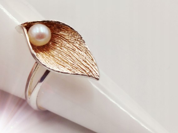 Dzisiaj w ofercie: piękny, stary, autorski, ciekawy, srebrny, damski pierścionek " LIŚĆ / LISTEK " delikatnie złocony z dodatkiem PERŁY, wykonany ze srebra 925, w rozmiarze 18 / 19 - biżuteria VINTAGE