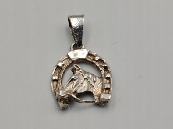 model / wzór: srebrny damski wisiorek / zawieszka w kształcie głowy konia na tle podkowy